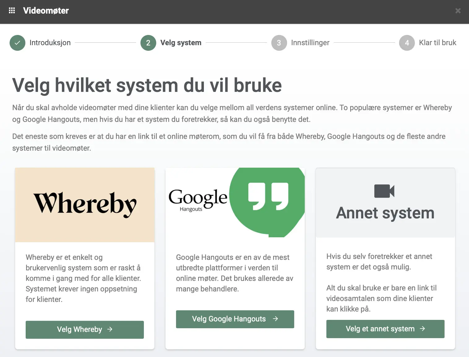 For å komme i gang med Videomøter, er du nødt til å gå inn i systemet under «Apps» og trykke «aktiver» på appen. Når du skal sette opp appen, vil vi be deg om å sette inn linken til ditt virtuelle behandlingsrom. Denne linken finner du inne på den eksterne plattformen du har valgt å bruke for ditt videomøte. På Whereby.com er det enkelt å finne linken og kopiere den. Dette er linken vi bruker og sender ut til klientene dine helt automatisk. Slik er prosessen superenkel for både deg og klientene dine, og du trenger ikke tenke på noe mer siden alt går automatisk.